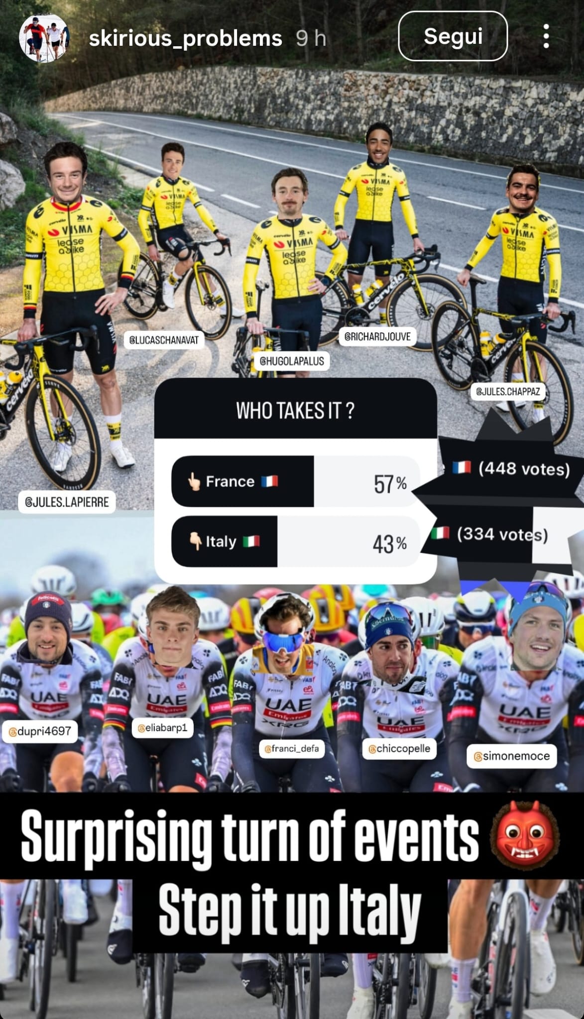 A supporto di questa tesi interviene il britannico Clugnet, che esclude un dominio scandinavo almeno in questa circostanza: “Quando fai ciclismo in Scandinavia, è tutto pianeggiante e puoi solo lavorare sulla distanza. E con gli scandinavi puoi renderti conto se in bici c’è uno sciatore o meno, è molto facile! Hanno una cadenza di 65/70 in media.” Da parte sua, però il 28enne nativo di Grenoble, tira l’acqua al mulino paterno e sostiene che sarebbero i francesi a vincere questa sfida: “Io a dire il vero direi Francia, perché sono degli animali da scalata, ma al contempo hanno anche degli sprinter che potrebbero far bene.”