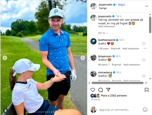 Oggi arriva la notizia di un’altra proposta di matrimonio in Svezia: il biathleta Jesper Nelin ha condiviso sui social diverse foto in cui la mano della sua compagna, Sandra Abremark, sfoggia un anello di fidanzamento. “Allenamento, vacanze e, come ciliegina sulla torta, un anello al dito” ha commentato nella didascalia che accompagnava il carosello di foto.