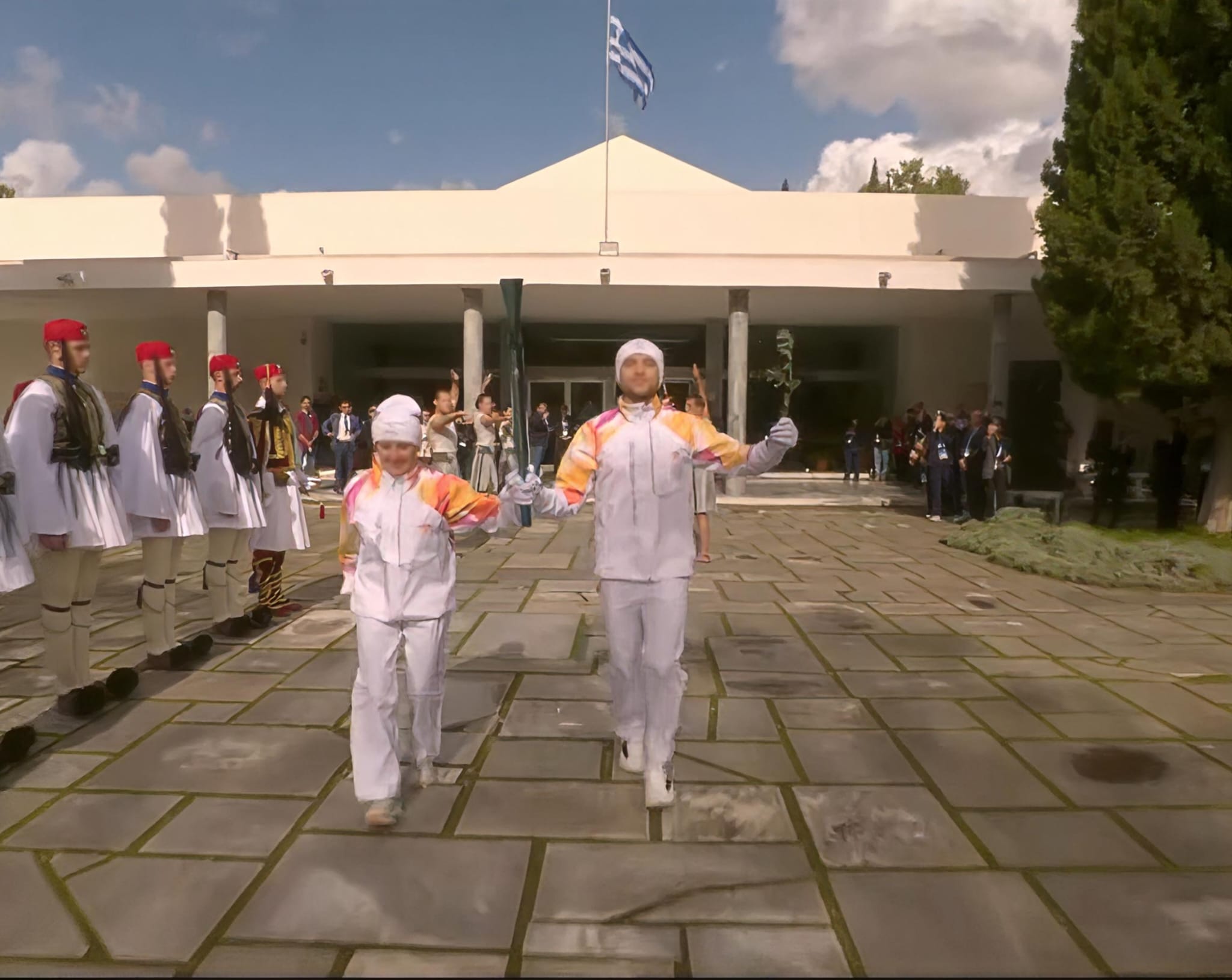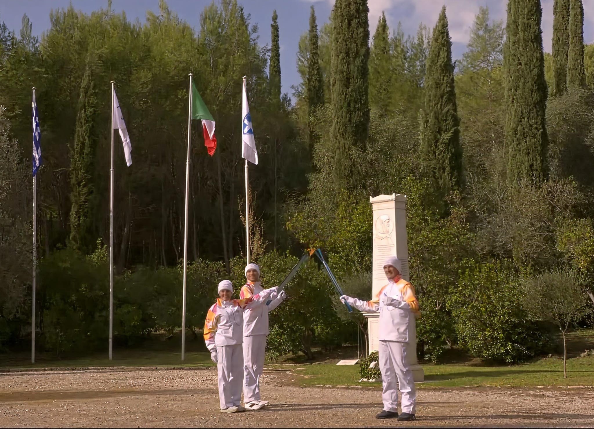 Come accaduto anche in occasione delle ultime Olimpiadi estive, a causa delle condizioni meteo, oltre al cambio di location, non è stato possibile questa mattina effettuare l’accensione attraverso piatto parabolico (noto agli antichi greci come Skaphia) che cattura i raggi del sole e accende la torcia. Il rituale si è svolto tramite l’urna che conserva il fuoco acceso nella maniera tradizionale durante le prove di lunedì; dopo questo rito la fiamma è consegnata da Hestiada (la sacerdotessa custode del fuoco) all’alta sacerdotessa, che l’ha passata al primo tedoforo, Petros Gkaidatzis, bronzo olimpico nel canottaggio a Parigi 2024, insieme a un ramo d’ulivo, simbolo universale di pace e riconciliazione. Gkaidatzis, che ha sostituito all’ultimo momento Alexander John Ginnis, inizialmente selezionato ma infortunatosi nel weekend a Gurgl, è stato, come tradizione vuole, scelto tra gli atleti greci per essere il primo tedoforo, che ha poi condiviso una lunga corsa verso il monumento a Pierre De Coubertin con Stefania Belmondo, leggenda dello sci di fondo azzurro. Lì l’azzurra ha ritrovato un’altra leggenda italiana delle discipline invernali, Armim Zoeggler, a sua volta plurimedagliato alle Olimpiadi nello slittino.