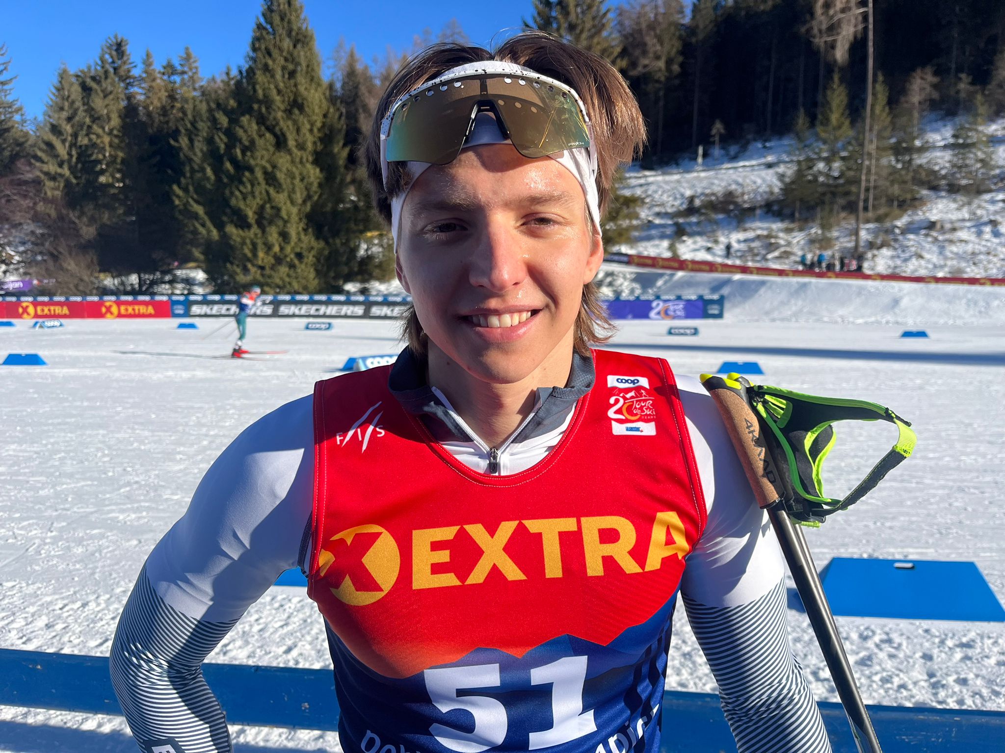 Sorride camminando per la mixed zone della Nordic Arena di Dobbiaco al termine della qualificazione alla sprint a skating. Pur avendo mancato l’ingresso nei trenta, lui che sprinter non è, Savelii Korostelev ha il sorriso di chi si trova nell’ambiente che ha sempre sognato, quello della Coppa del Mondo.